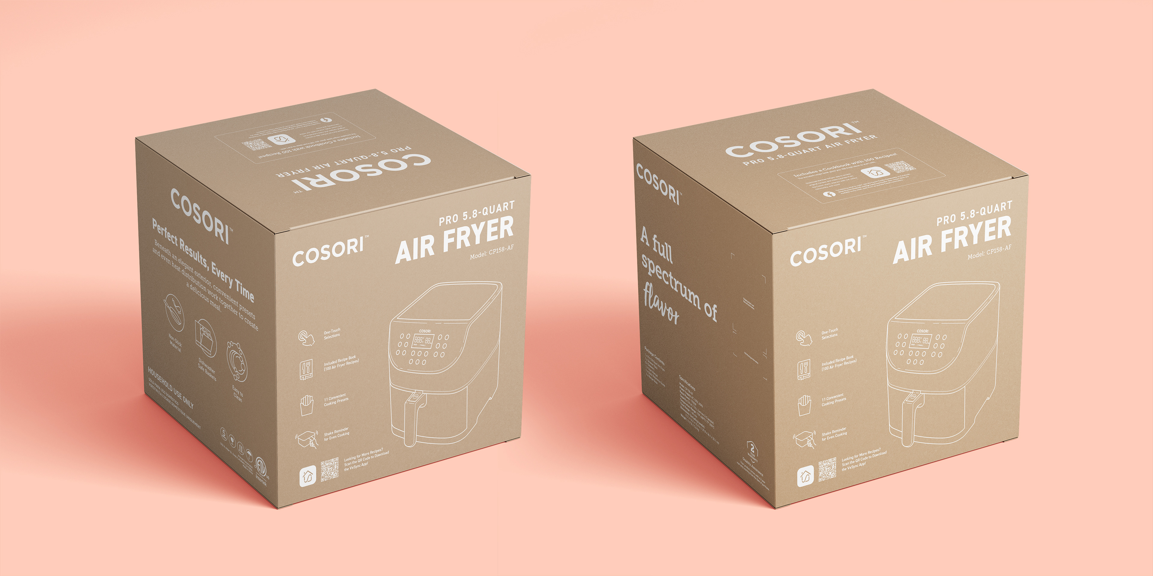 During the rebrand of COSORI in 2020, another redesign was requested to fit the updated brand style and guidelines. I created new packaging for both Amazon and Retail markets.